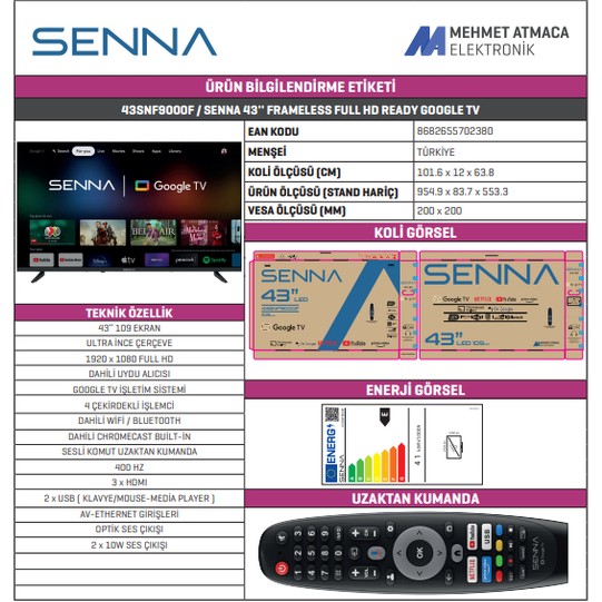 Senna 43SNF9000F 43” 109 Ekran Uydu Alıcılı Full HD Google Smart LED TV