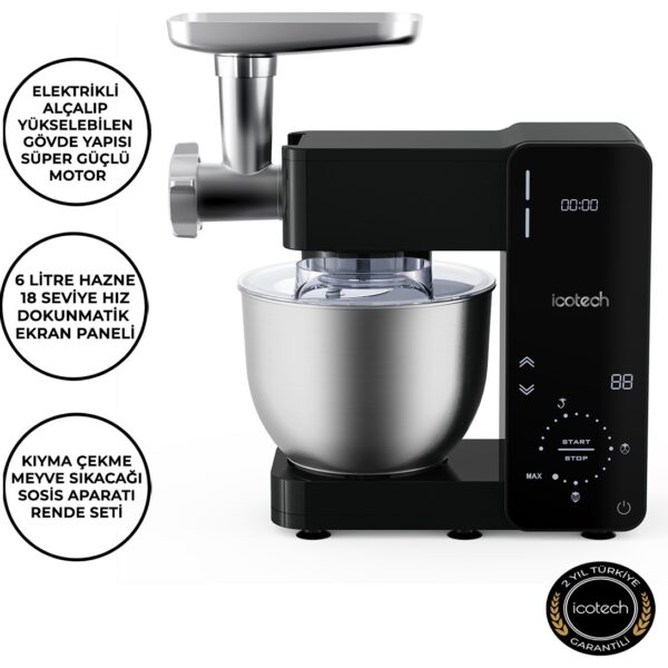 Icotech SM60 6 Lt Hamur Yoğurma Kıyma Çekme Katı Meyve Sıkma Profesyonel Stand Mikser Mutfak Şefi