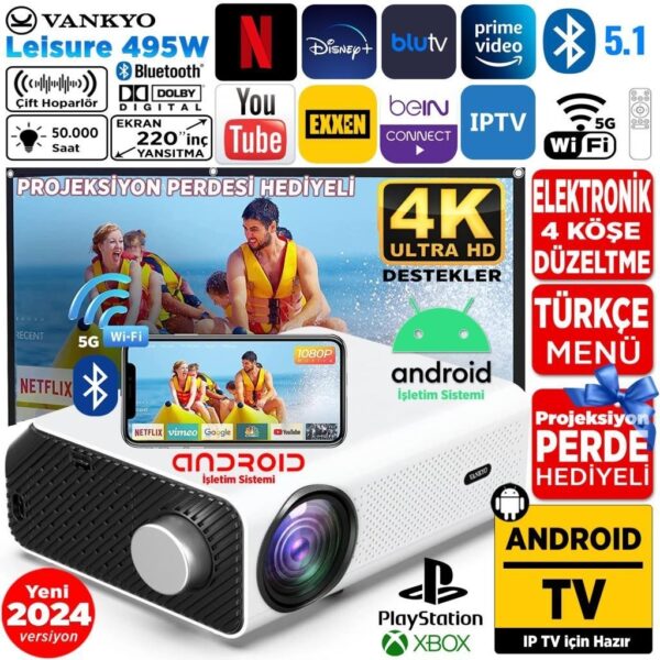 Vankyo Leisure 495W Android 4K Destekli 5g Wi-Fi + Bluetooth LCD LED Projeksiyon Cihazı – 220 Inç Yansıtma -Dolby Audio Hoparlör