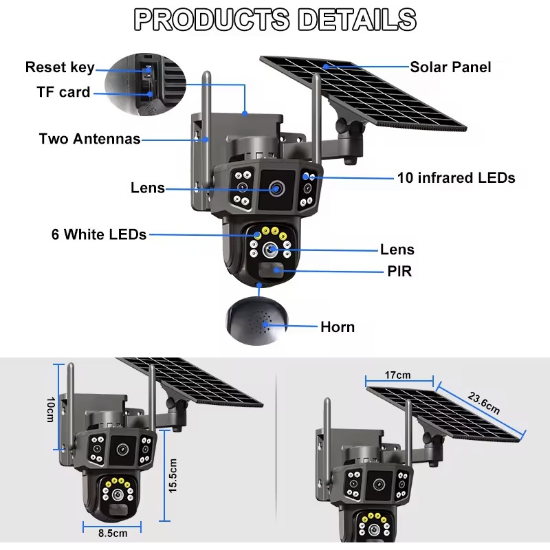 Bu ürün, 4G sim kart desteği ile çalışan, güneş enerjisi ile şarj edilebilen, Full HD çift kameralı ve ekstra LEDli akıllı güvenlik kamerasıdır. Güneş enerjisi sayesinde sürekli çalışabilir ve kablosuz olarak kullanılabilir. Ayrıca, hareket algılama özelliği sayesinde anlık bildirimler alabilir ve uzaktan erişim ile kamerayı kontrol edebilirsiniz. Bu ürün, evinizin veya işyerinizin güvenliğini sağlamak için ideal bir seçenektir.