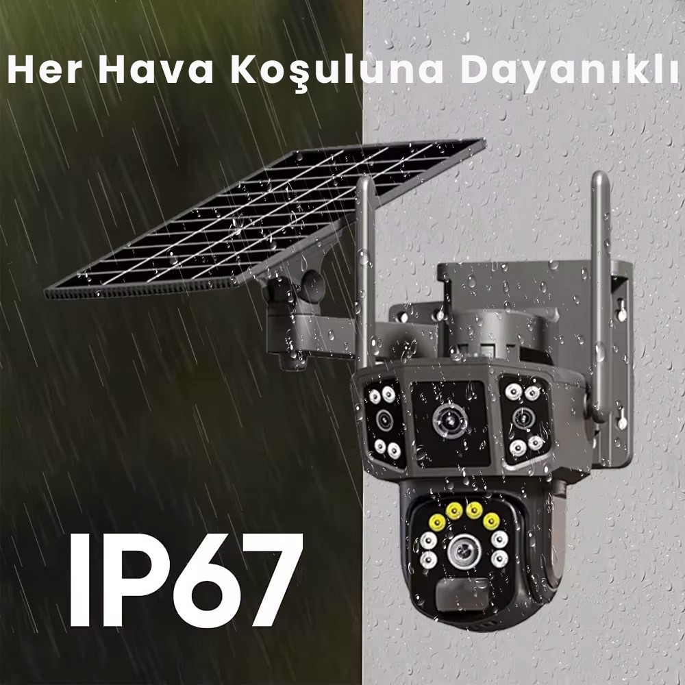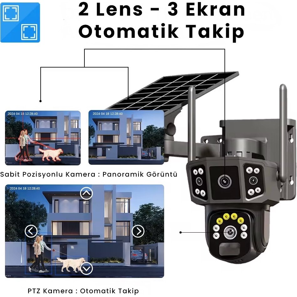 4K, Solar Panelli Kamera, Çift Lens, 10X Zoom, SIM Kart Destekli, IP Kamera, Kablosuz 4G Güneş Enerjili Kamera