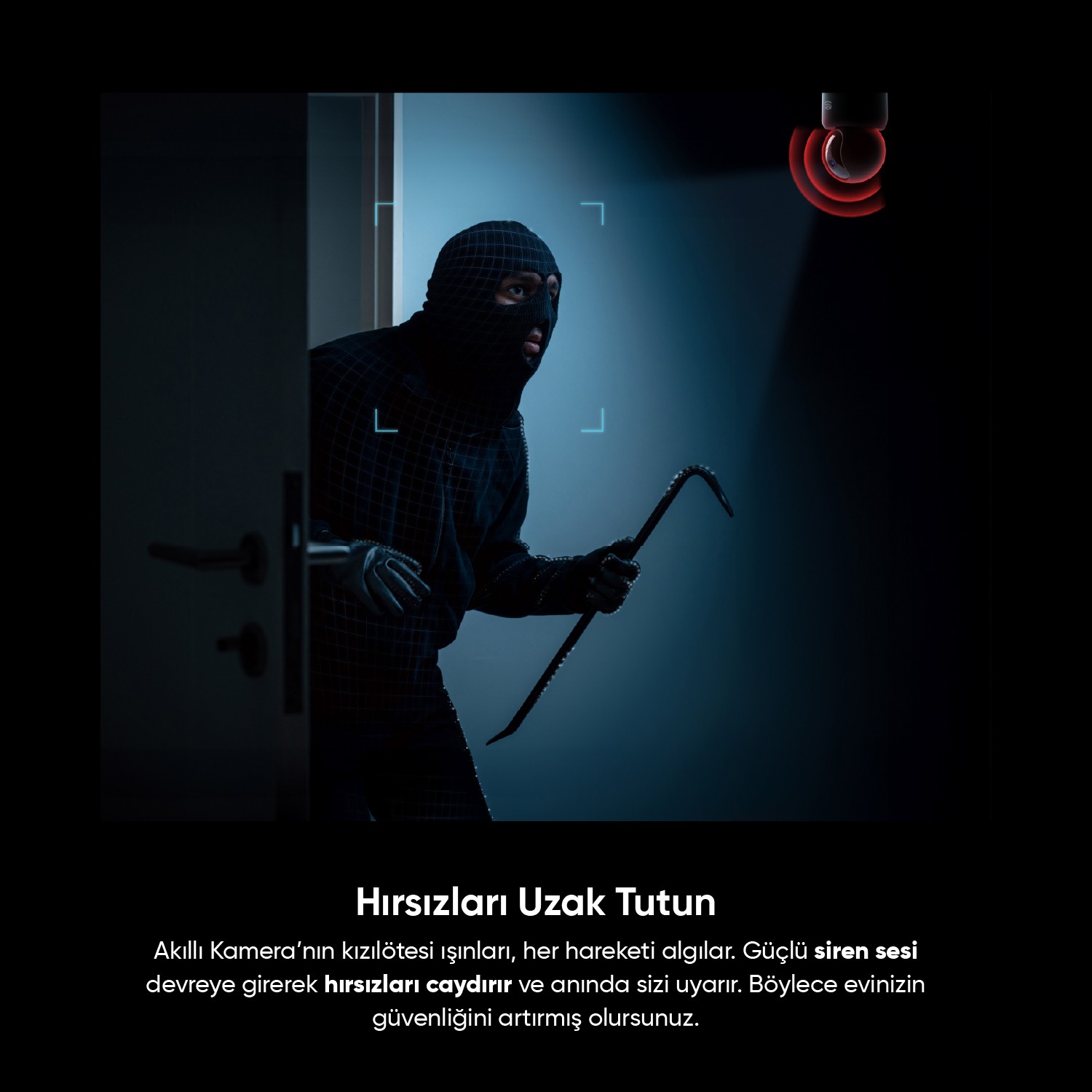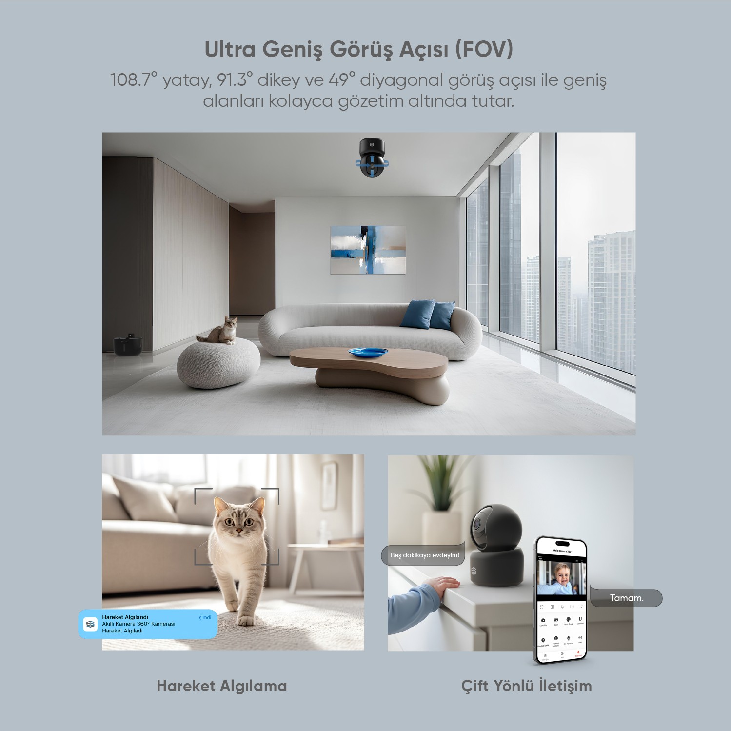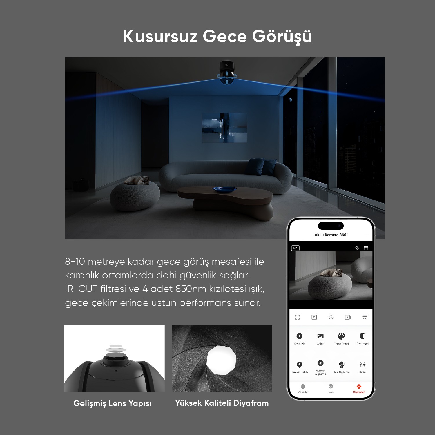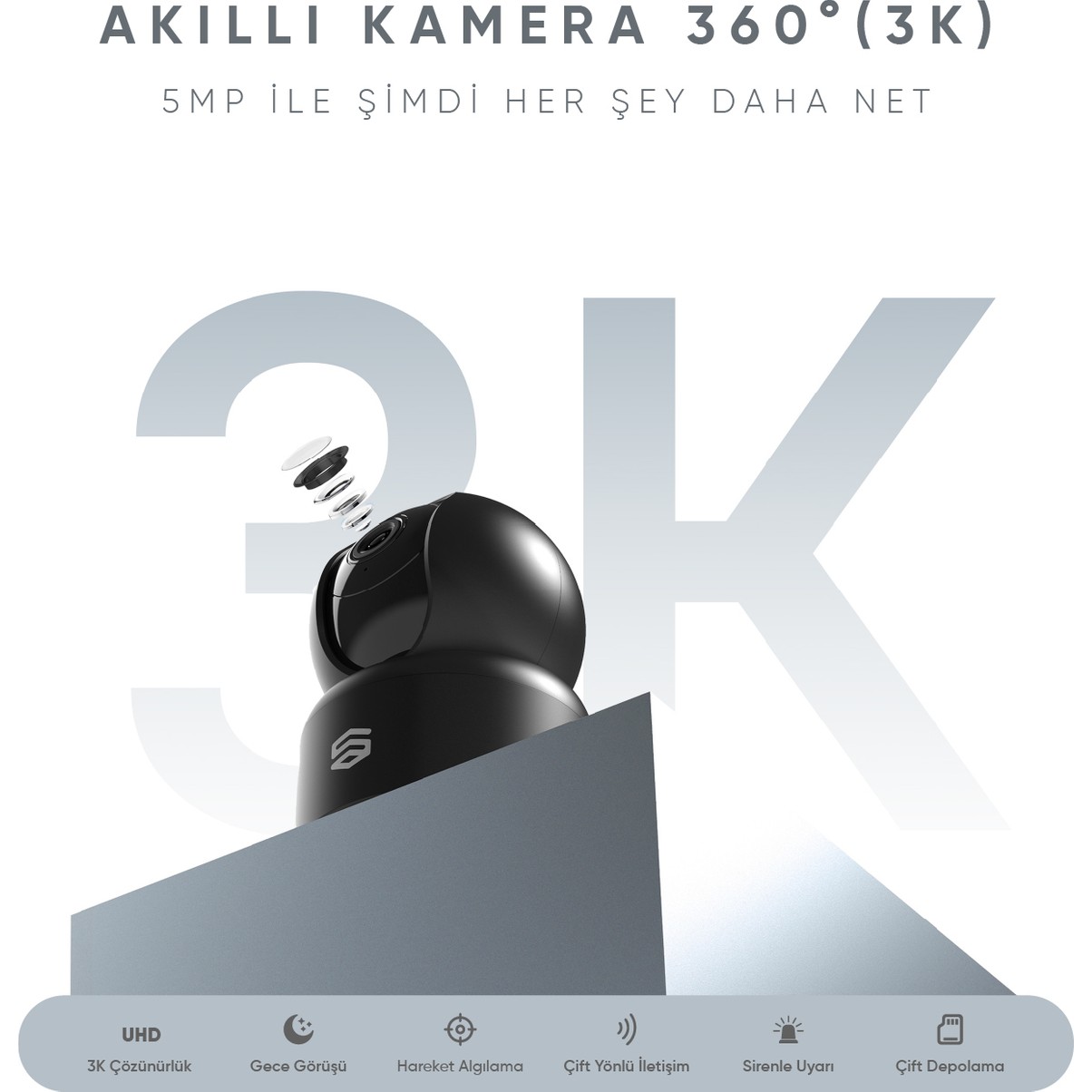 Bu ürün, 360° geniş açılı çekim yapabilen akıllı bir kameradır. Wi-Fi özelliği sayesinde kablosuz olarak bağlanabilir ve görüntüleri anlık olarak izleyebilirsiniz. 1620p 3K çözünürlüğü ile yüksek kaliteli videolar çekebilirsiniz. Gece görüş özelliği sayesinde karanlık ortamlarda bile net görüntüler elde edebilirsiniz. Ayrıca ses gönderme ve alma özelliği ile kamerayı uzaktan kontrol edebilir ve iletişim kurabilirsiniz. Bu ürün, ev güvenliği, bebek izleme veya araç güvenliği gibi çeşitli alanlarda kullanılabilir.