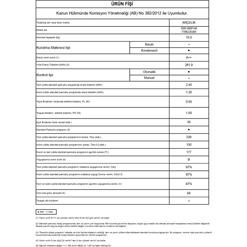 Arçelik 1000 Kmp Ha A++ 10 kg Çamaşır Kurutma Makinesi için 1 değerlendirme