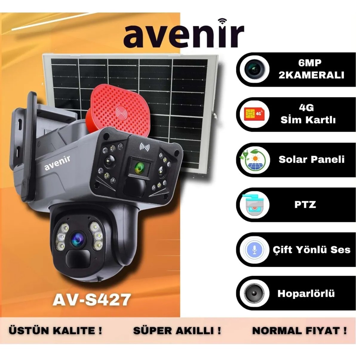 Avenir AV-S427, 3MP çözünürlüğe sahip iki adet kamerası bulunan, toplamda 6MP çözünürlüğe sahip bir güneş enerjili kameradır. 4G sim kart desteği sayesinde internet bağlantısı sağlayabilir ve uzaktan erişim imkanı sunar. PTZ özelliği sayesinde kamerayı uzaktan yönlendirebilir ve istediğiniz yöne çevirebilirsiniz. Güneş enerjisi ile çalışan bu kamera, enerji tasarrufu sağlar ve uzun süre kesintisiz çalışabilir. Avenir AV-S427, güvenlik amaçlı kullanılan bir kamera olup, açık alanlarda güvenlik ihtiyacını karşılamak için ideal bir seçenektir.