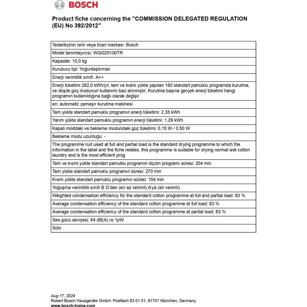 Tuşlar, LCD Ek fonksiyonlarPamuklu, Gömlekler/Bluzler, Pamuklu Eko, Kuş tüyü, Narinler, Havlular, karışık, Süper kısa 40′, spor giysileri, Yorgan, Sentetik, yünlülerde son uygulama, Zaman programı soğuk, Zaman programı sıcak Ses seviyesi64 dB(A) re 1pW B Su çıkış borusuMevcut Serie 4, Isı Pompalı Kurutma Makinesi, 10 kg WQG25100TR WMZ20600 : WTZ1110 Kurutma makinesi aksesuarı WTZ11400 Kurutma makinesi aksesuari WTZ20410 Bağlantı Seti WTZPW20D Platform ve çekmece A++ enerji sınıflı kurutma makineleri ile yüksek enerji verimliliği. • AutoDry: Tam istediğiniz derecede otomatik kurutma. • Titreşim önleyici yan duvarlar sayesinde son derece kararlı ve özellikle sessiz. • Hassas Kurutma Sistemi: Kırışıklık olmadan hassas yıkama. • SensitiveDrying: Özel tambur yapısı ile narin kurutma. • 40 dakika içerisinde mükemmel kurutma. Ürün Tipi: ………………………………………………………………………….Solo Çıkarılabilir üst kapak: ……………………………………………………….hayır Kapı yönü: ………………………………………………………………………….Sağ Elektrik kablosu uzunluğu: ……………………………………………145.0 cm Ürün Ölçüleri (Yükseklik x Genişlik x Derinlik): ……842x598x613 mm Net Ağırlık: ……………………………………………………………………49.0 kg Florlu sera gazları: …………………………………………………………….Hayır Hermetik sızdırmazlık ekipmanı: ……………………………………………Evet EAN numarası: …………………………………………………..4242005492725 Güç: ………………………………………………………………………………625 W Akım: ………………………………………………………………………………..10 A Nominal gerilim: …………………………………………………………220-240 V Frekans: ………………………………………………………………………….50 Hz Kapasite: ………………………………………………………………………10.0 kg Enerji sınıfı: ………………………………………………………………………..A++ en: Energy consumption electric dryer, full load – NEW (2010/30/EC): ………………………………………………………………………………….2.35 kWh Standard cotton programme time at full load: ……………….270 dakika Energy consumption electric dryer, partial load – NEW (2010/30/EC): ………………………………………………………………………………….1.29 kWh Standard cotton programme time at partial load: …………..154 dakika Weighted annual energy consumption, electric dryer – NEW (2010/30/EC): ………………………………………………………282.0 kWh/yıl Weighted programme time: …………………………………………204 dakika Average condensation efficiency full load (%): ……………………….83 % Average condensation efficiency partial load (%): …………………..83 % Weighted condensation efficiency (%): …………………………………83