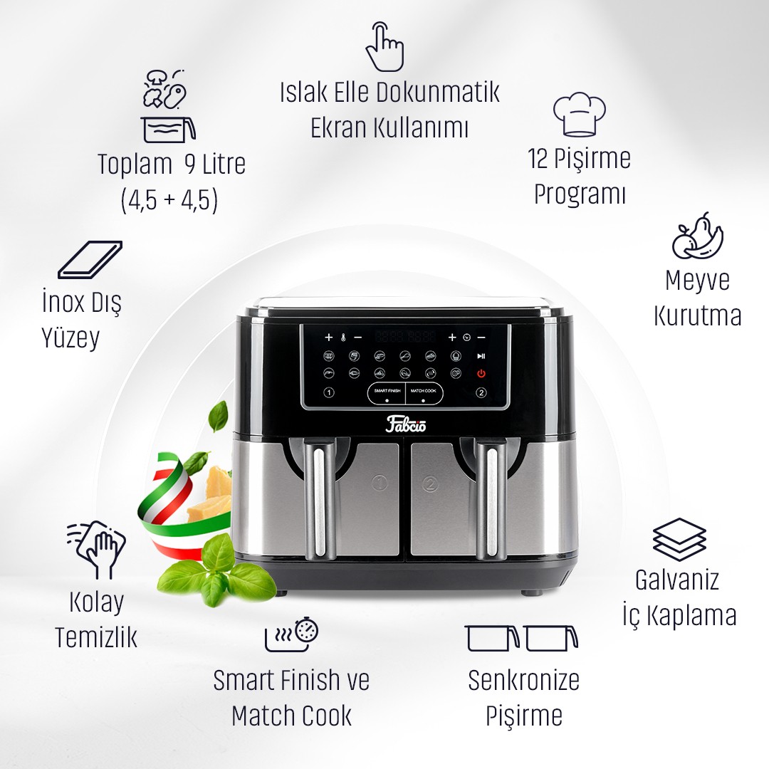 Fabcio Duo V2 Dokunmatik Ekran 9lt Çift Hazneli Airfryer Yağsız Fritöz