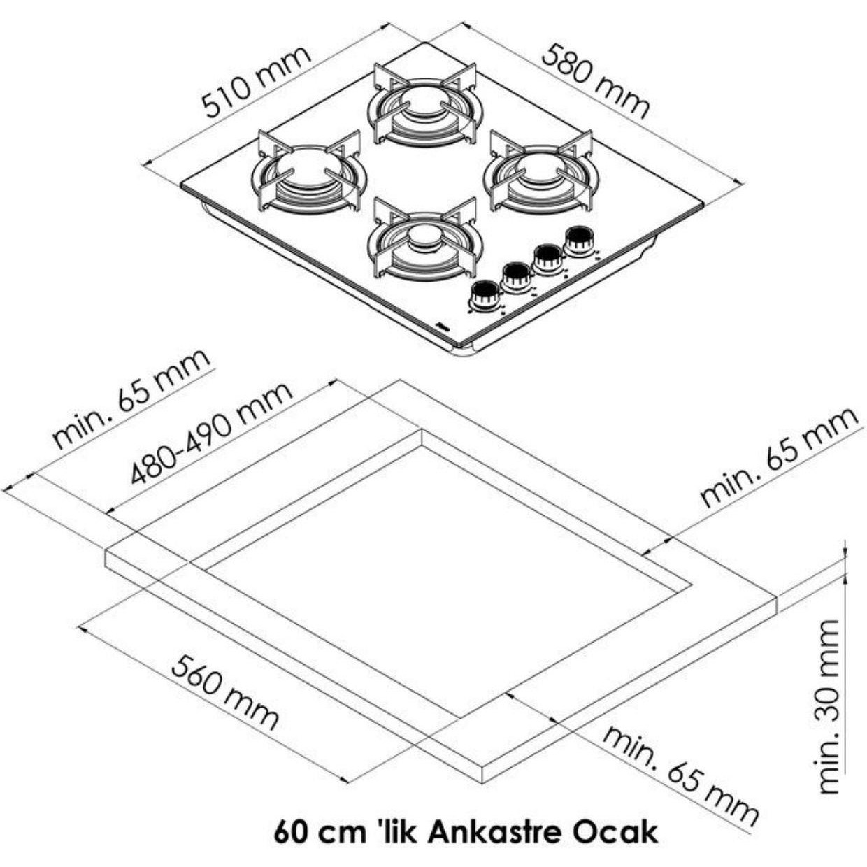 • 60 cm 4 gözü gazlı ankastre siyah cam ocak