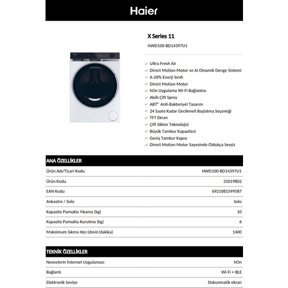 Haier HWD100-BD14397US 10 kg Yıkama 6 kg Kurutma Wi-Fi + Bluetooth Bağlantılı 1400 Devir Kurutmalı Çamaşır Makinesi