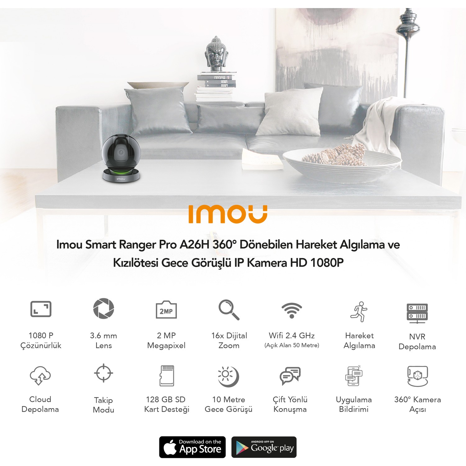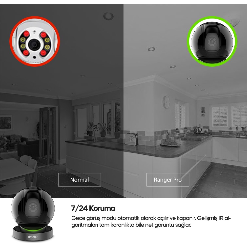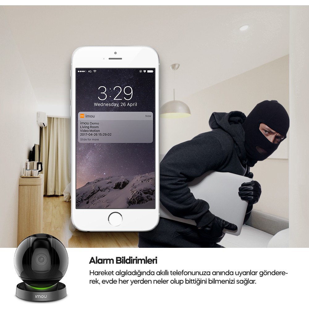 Imou Smart Ranger Pro A26H, 360° dönebilen bir IP kamera olup HD 1080P çözünürlük sunmaktadır. Hareket algılama özelliği sayesinde herhangi bir hareket algılandığında bildirim alabilirsiniz. Ayrıca kızılötesi gece görüşü özelliği ile gece boyunca net ve kesintisiz görüntü alabilirsiniz. Bu ürün evinizde, iş yerinizde veya dilediğiniz herhangi bir mekanda güvenlik amaçlı kullanabilirsiniz.