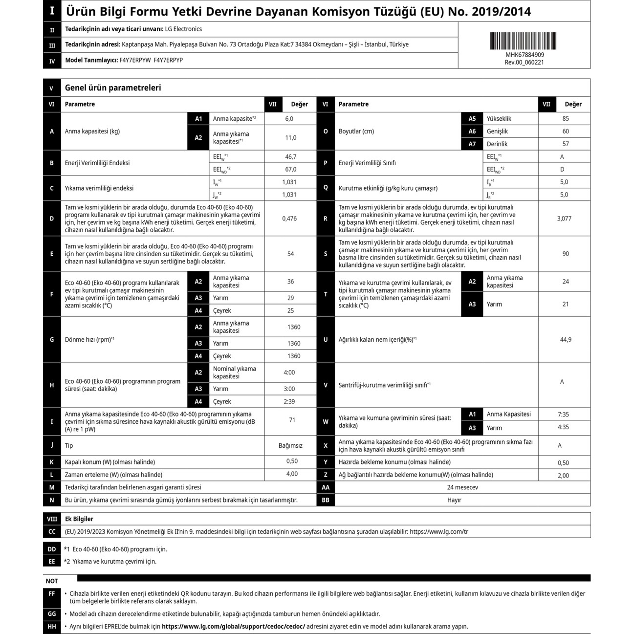 LG F4Y7ERPYW 11 kg yıkama kapasitesi ve 6 kg kurutma kapasitesi ile geniş bir yıkama ve kurutma alanı sunar. 1400 devir hızıyla hızlı ve etkili bir şekilde çamaşırlarınızı temizler ve kurutur. Aı Dd™ teknolojisi sayesinde enerji verimliliği sağlar ve çamaşırlarınızı daha az enerji harcayarak yıkar ve kurutur. Beyaz renkli şık tasarımıyla her türlü banyo dekoruna uyum sağlar. Kurutmalı çamaşır makinesi olarak da kullanılabilmesi pratik bir çözüm sunar.