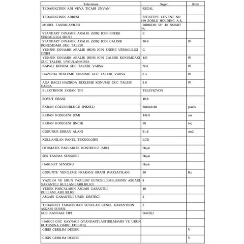 Regal 58R66U01 58” tam bir performans televizyonu. Görüntü ve ses kalitesi mükemmel. Tereddüt etmeden gönül rahatlığıyla alabilirsiniz. Çerçevesi yok denecek şekilde… Tv seyrederken ekran görüntüsü keyif veriyor.