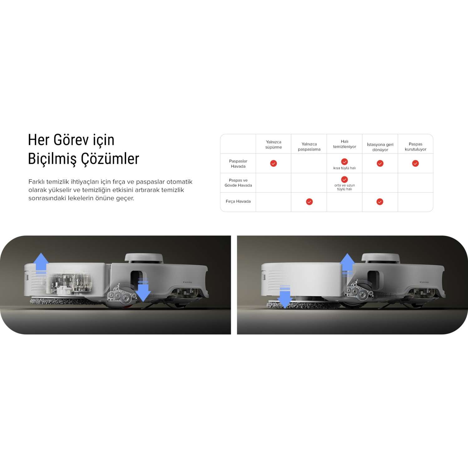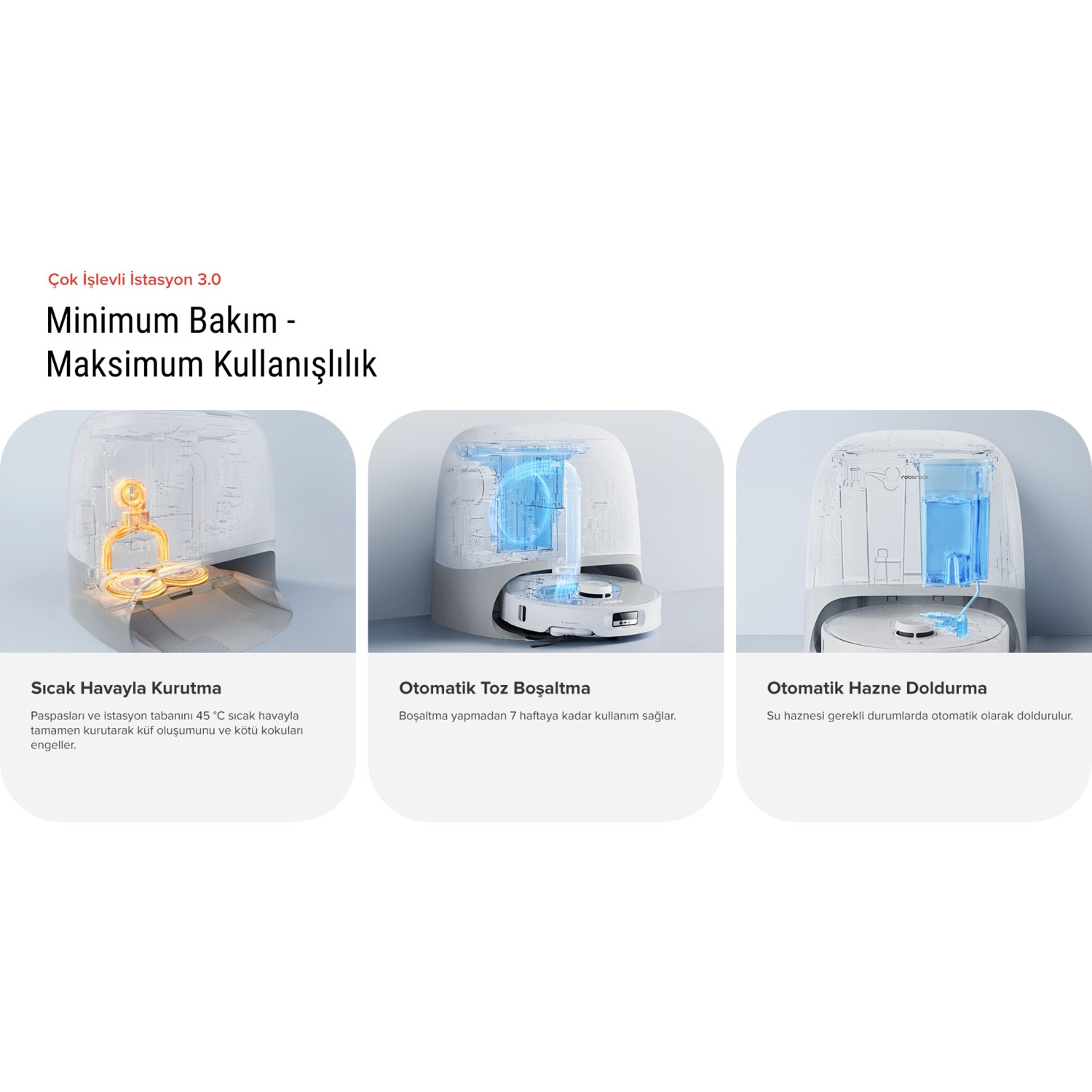 Ürün öncelikle estetik olarak çok şık duruyor. Temizliğinden de memnun kaldım, bütün paspas ve süpürme fonksiyonlarını kendi istediğinize göre kişiselleştirebiliyorsunuz, obje tanıma ve önlem alma, haritalandırma tutarlılığı da gayet başarılı. İstasyonda paspas yıkama ve kurutma işlemi çok gürültü yapmıyor, kurutma yaparken enerji tasarrufu modunda sessizce sıcak hava üflüyor. Paketin içinden hem kullanıma hazır toz torbası hem de yedek toz torbası çıktı.