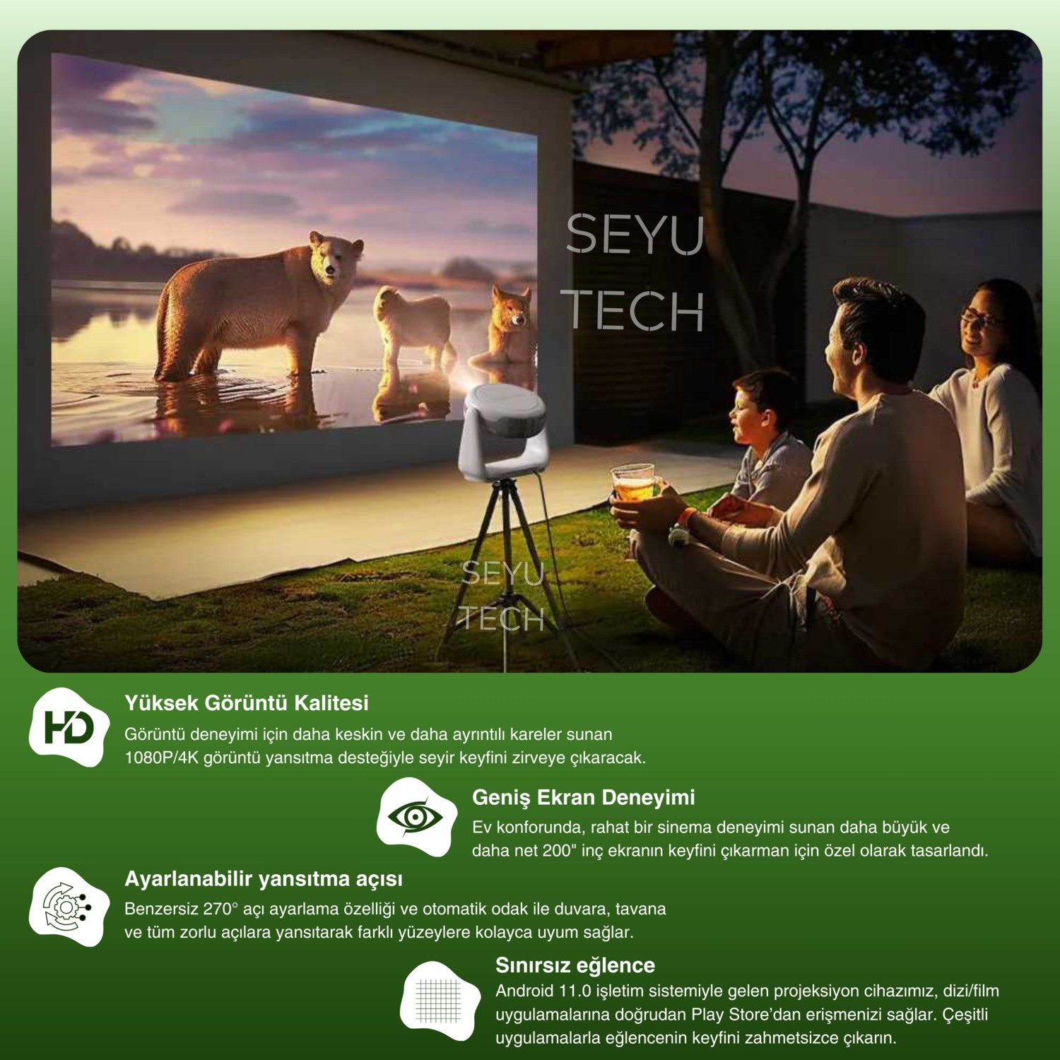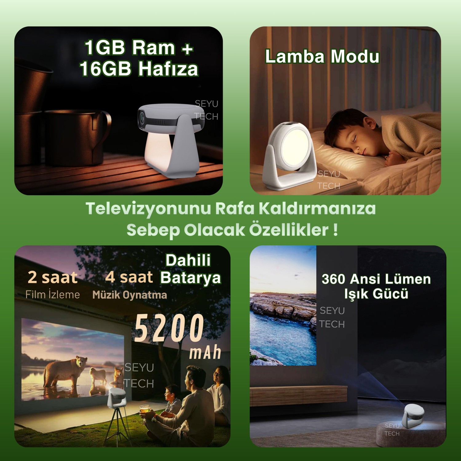 Bu cihaz, Seyutech markasının taşınabilir sinema projeksiyon cihazıdır. 4K destekli 1080P çözünürlüğe sahiptir ve Android işletim sistemine sahiptir. Ayrıca içerisinde bir powerbank bulunmaktadır, bu sayede cihazı şarj etmeden uzun süre kullanabilirsiniz. Taşınabilir olması sayesinde istediğiniz her yerde sinema keyfi yaşayabilirsiniz.