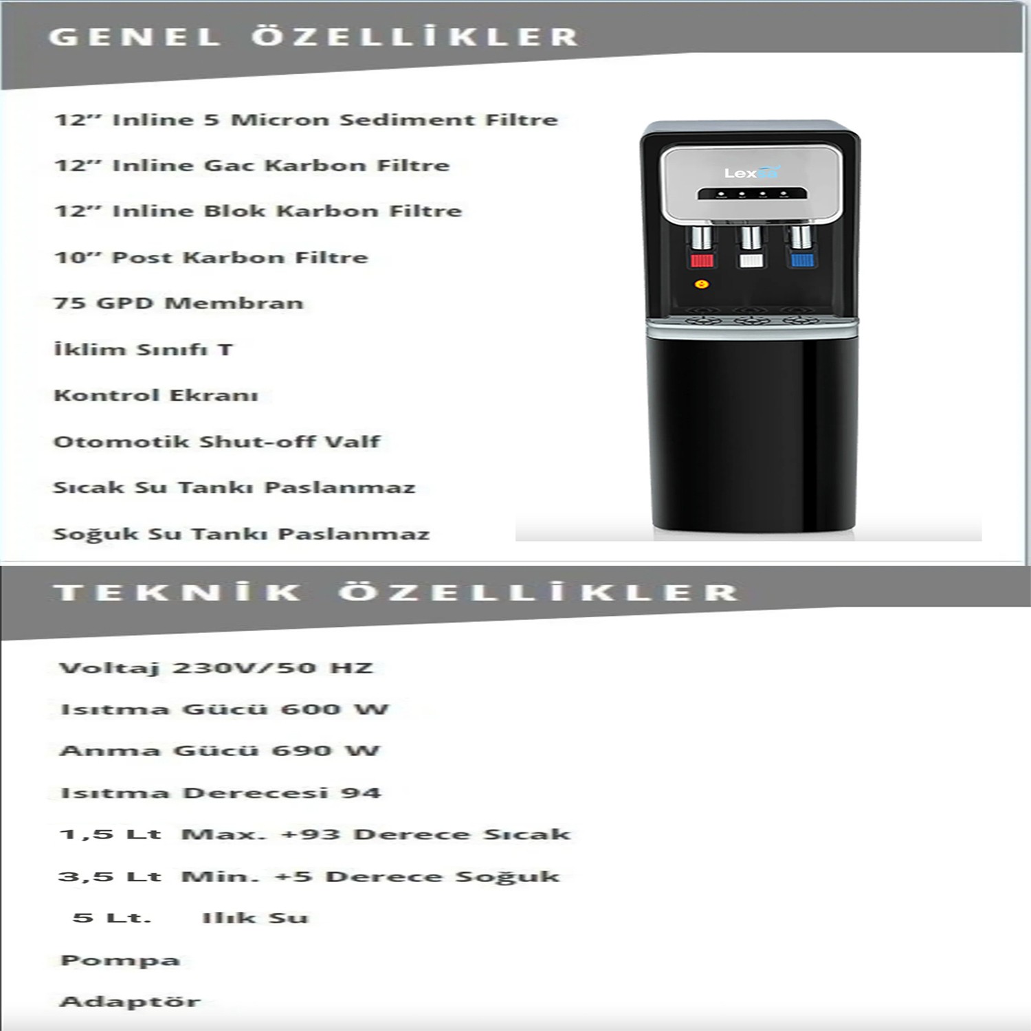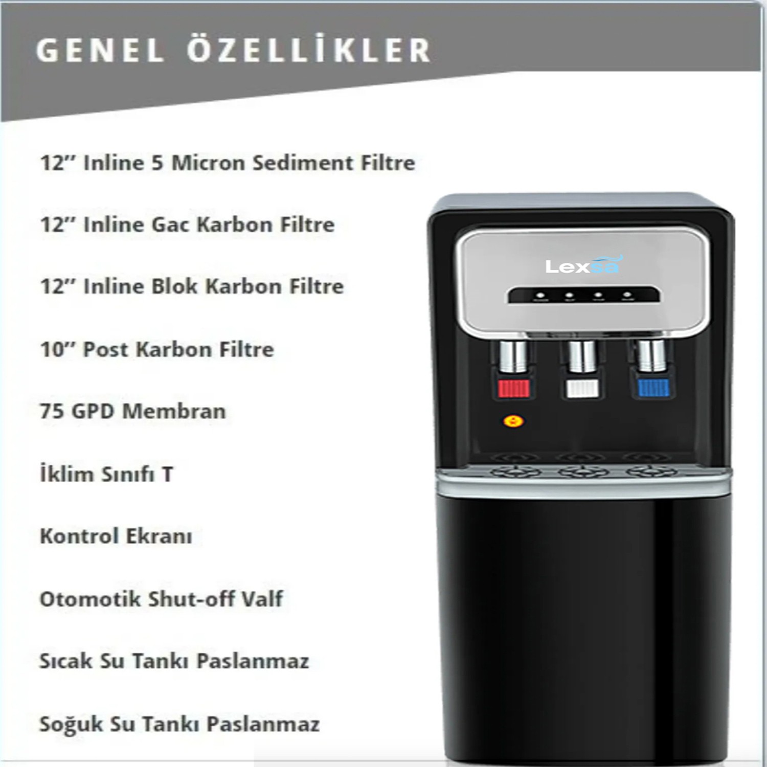 Bu su sebili, sıcak, soğuk ve normal su çıkışı sağlayarak kullanıcıların ihtiyaçlarına göre su sıcaklığını ayarlayabilmesini sağlar. Ayrıca içme suyunu arıtarak daha sağlıklı bir içme suyu sunar. Kullanımı kolay ve pratik olan bu su sebili, ev, ofis veya diğer işletmelerde rahatlıkla kullanılabilir. Tasarımı şık ve modern olduğu için her türlü dekorasyona uyum sağlar. Hem pratik hem de sağlıklı bir su içme deneyimi sunan bu su sebili, günlük hayatta vazgeçilmez bir yardımcı olacaktır.