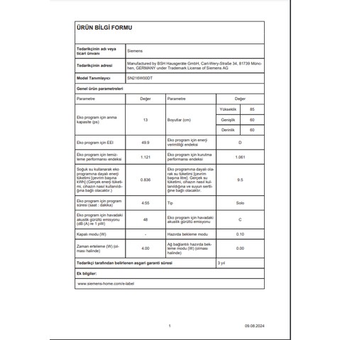 Siemens SN216W00DT 6 Programlı 13 Kişilik Bulaşık Makinesi