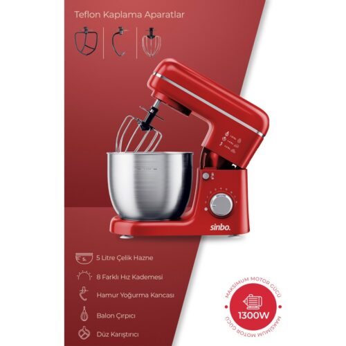 Sinbo SMX-2771 Stand Mikser | 1300W, 5l, Çok Fonksiyonlu Stand Mikser – Mutfak Şefi Kırmızı