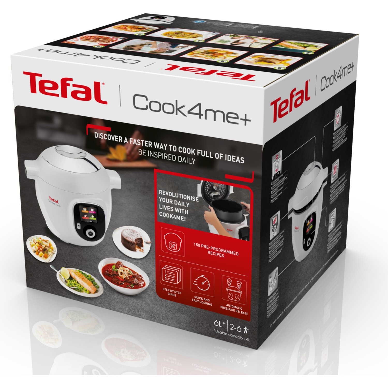 COOK4ME Akıllı Çoklu Pişirici, 6 litrelik geniş kapasitesi ile büyük aileler veya misafirler için idealdir. Ayrıca, basınçlı pişirme özelliği sayesinde yemeklerin daha hızlı pişmesini sağlar ve besin değerlerini korur.