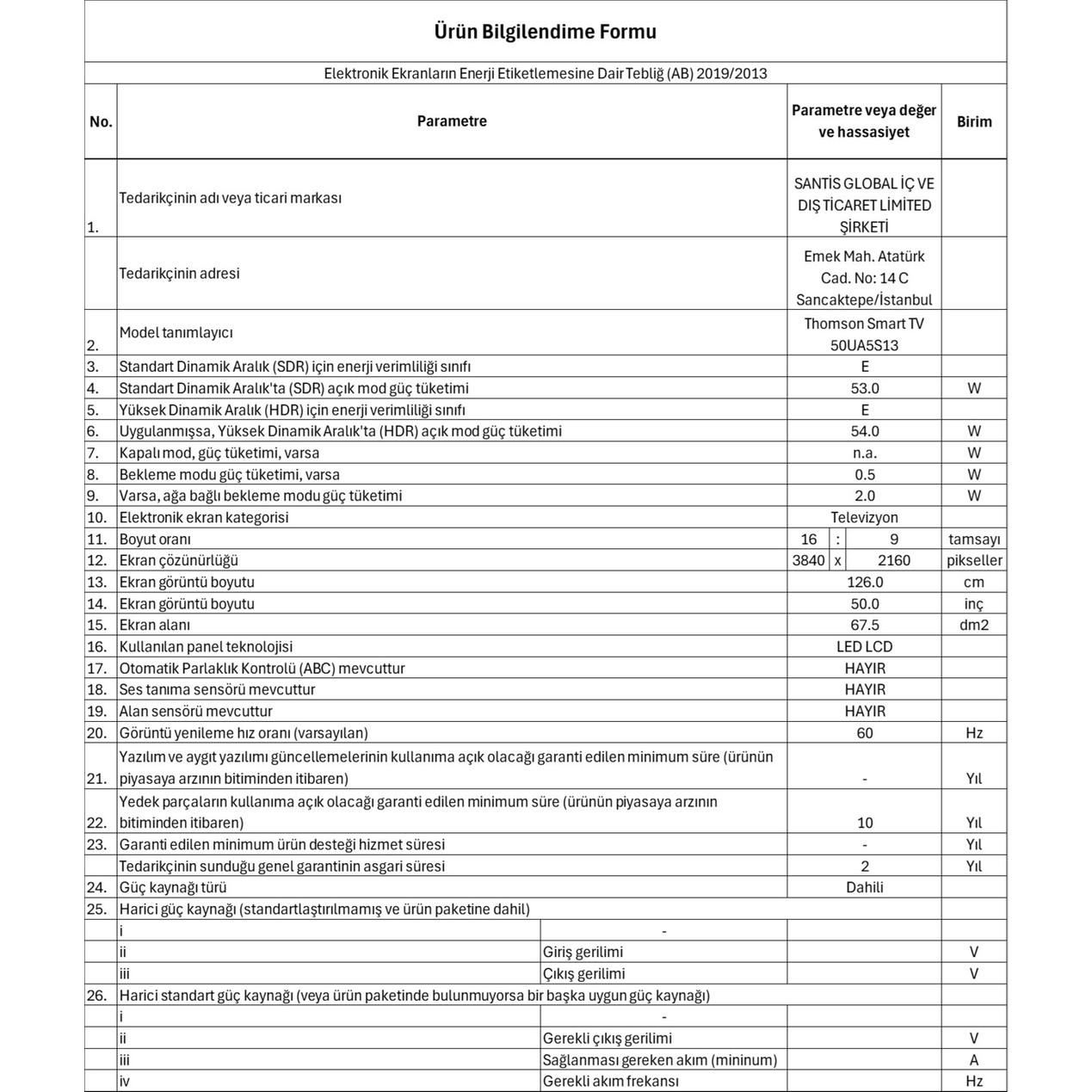 Thomson 50UA5S13 50″ 126 Ekran Uydu Alıcılı 4K Ultra HD Android LED TV, yüksek çözünürlüklü 4K görüntü kalitesi sunan, Android işletim sistemine sahip bir televizyondur. 126 ekran boyutuyla geniş bir izleme alanı sunar ve Uydu alıcısı sayesinde favori kanallarınızı kolayca izlemenizi sağlar. Ayrıca, akıllı TV özellikleri sayesinde internete bağlanabilir, uygulamaları kullanabilir ve diğer cihazlarla entegre çalışabilirsiniz. Şık tasarımı ve kullanıcı dostu arayüzü ile ev eğlencesini bir üst seviyeye taşır.