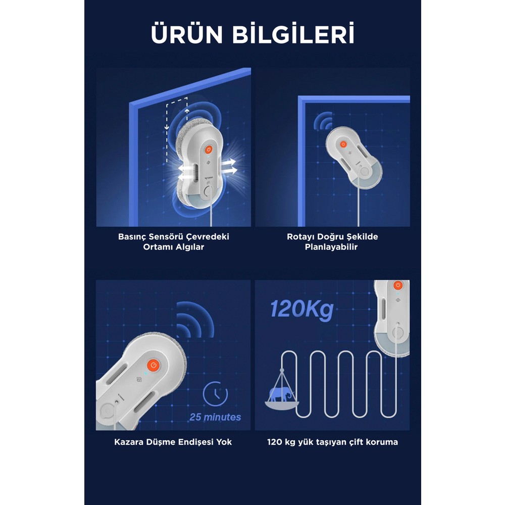 Torima S8 Beyaz Su Püskürtmeli Uzaktan Kumandalı Mobil Ap Control Cam Temizleme Robotu, cam temizliği için tasarlanmış akıllı bir cihazdır. Uzaktan kumanda ile kontrol edilebilir ve su püskürtme özelliği sayesinde cam yüzeyleri etkili bir şekilde temizler. Yüksek teknoloji sensörleri sayesinde engelleri algılayarak güvenli bir şekilde temizlik yapar. Kompakt tasarımı sayesinde dar alanlara kolayca girebilir ve temizlik işlemini hızlı bir şekilde tamamlayabilir. Torima S8, ev veya ofis camlarınızı kolayca temizlemek için ideal bir seçenektir.