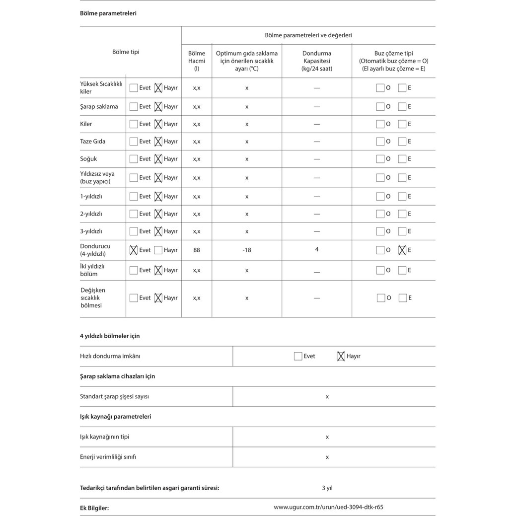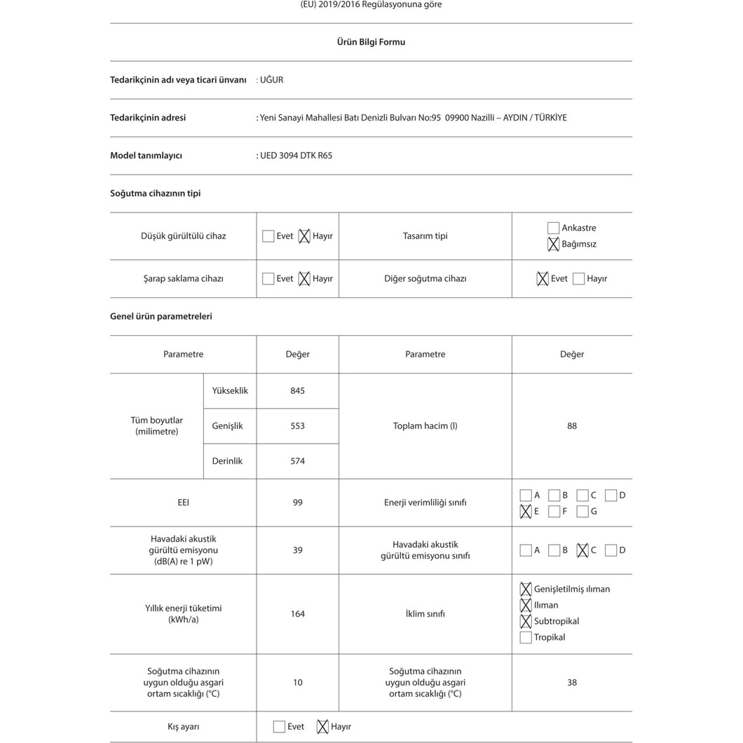 Uğur Ued 3094 Dtk R65 E Enerji Sınıfı 88 lt Statik Derin Dondurucu