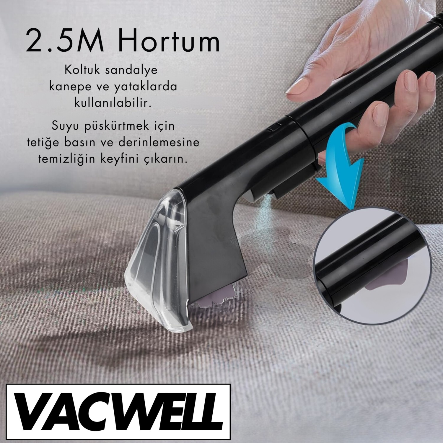 Vacwell Hidro Halı ve Koltuk Yıkama Makinesi, evinizdeki halı ve koltukları derinlemesine temizlemek için tasarlanmış bir üründür. Yüksek basınçlı su püskürtme özelliği sayesinde zorlu lekeleri ve kirleri kolayca temizler. Ayrıca vakum özelliği ile suyu hızlıca emerek kısa sürede kurumasını sağlar. Bu makine, halı ve koltuklarınızı hijyenik bir şekilde temizlemek için ideal bir çözüm sunar. Üstelik kompakt tasarımı sayesinde depolama konusunda da pratiklik sağlar.