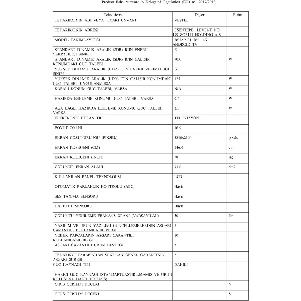 Vestel 58UA9631 58″ 147 Ekran Dahili Uydu Alıcılı 4K Ultra HD Android Smart LED TV için 3 değerlendirme