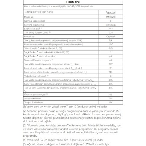 Vestel Km 86201 8 kg Kurutma Makinesi için 6 değerlendirme