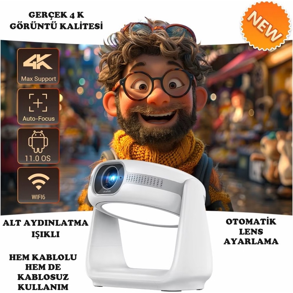Yeelock Taşınabilir Sinema Projektörü 4K Şarjlı Bluetooth Android Akıllı Hoparlörlü Işıklı Gerçek 4K